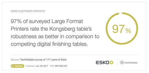 “Saya telah dapat menggandakan hasil produksi dengan meja potong Esko Kongsberg kami. Saya membawa seseorang untuk menjalankan meja potong dan mereka tidak memiliki pengalaman sebelumnya dalam mencetak atau finishing dan mereka dapat menyelesaikan dua kali lipat lebih banyak dibanding karyawan berpengalaman kami, bahkan dengan sedikit pelatihan. – Production Manager, Small Business Professional Services Company