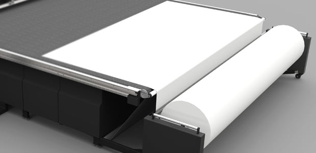 Esko Kongsberg C dapat dilengkapi dengan roll feeder berformat lebar untuk mendukung bahan roll berat seperti tekstil, vinyl … hingga bahan lebar 3330mm (131 inci).
