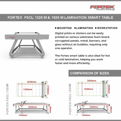 Fortex Smart Laminating Table hadir dengan dua pilihan ukuran area kerja, yakni 1300 × 2500 mm (FORTEX FSCL 1325M) dan 1500 × 3000 mm (FORTEX FSCL 1530M), yang memungkinkan proses kerja pada media berukuran besar dengan hasil rapi dan akurat. Mesin ini dilengkapi dengan sistem pemanas yang dapat diatur hingga suhu 60 °C, membantu proses perekat bekerja lebih cepat dan merata di seluruh permukaan bahan.